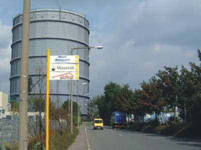 Übersicht mit Lageplan und einzelne Firmenwegweiser im Gewerbegebiet Stuttgart Wangen.