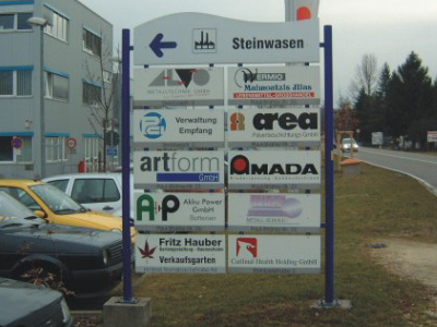 Aluminium-Profilrohr mit angeschraubten Schildern beidseitig im Format 700 x 300 mm.