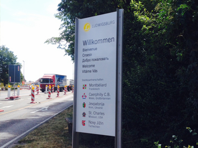 Willkommensstele mit Partnerstädten - an den Ortseingängen.