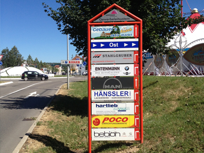 Standort Heininger Straße - Sammelhinweisschild mit bis zu neun Firmenschildern mit Richtungspfeil im Format 1000x250mm.